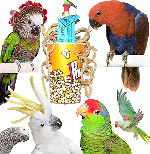 -. Feature : This foraging bird toy features corn cob, corn husks, finger traps, loofah, jute sticks, crinkle paper, wood spools, palm chain, woven vines, shredded paper, blocks of wood, and other natural toy parts that birds enjoy chewing, shredding or tearing up / Make this a foraging toy by hiding your bird's favorite treats inside! / This super fun toy is sure to keep your bird occupied for hours and is hung by a wooden rod with wooden spools and foam toy parts in between. / ApproP.R.Iate for medium to larger birds that enjoy shredding, preening and tearing, but are not strong chewers. We recommend this toy for larger conures, pionus parrots, caiques, african greys, eclectus parrots, galah cockatoos, and similarly sized birds. Heavy chewers will destroy this toy quickly - so this toy is not recommended for those. / Measures: about 14"L (total hanging) x 7 1/4"W x 6". This toy is hung up with stainless steel wire and quick link.