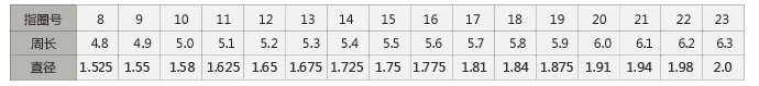 直径是指手指的宽度,亲们可以多测量几次以达到最准确的数据,下图是对照表