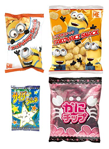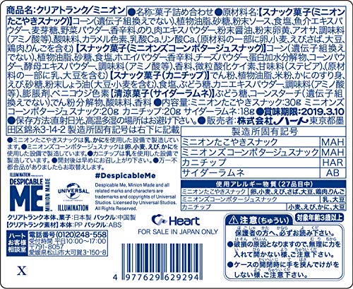 原材料:【スナック菓子(ミニオンたこやきスナック)】コーン(遺伝子組換えでない)、植物油脂、砂糖、粉末ソース、食塩、魚介エキスパウダー、麦芽糖、野菜パウダー、香辛料、のり、肉エキスパウダー、粉末醤油、粉末卵黄、アオサ、調味料(アミノ酸等)、酸味料、カラメル色素、乳酸Ca、リン酸Ca、(原材料の一部に卵、小麦、えび、さば、大豆、鶏肉、りんごを含む)【スナック菓子(ミニオンズコーンポタージュスナック)】コーン(遺伝子組換えでない)、植物油脂、砂糖、食塩、ホエイパウダー、香辛料、チーズパウダー、蛋白加水分解物、コーンパウダー、酵母エキスパウダー、調味料(アミノ酸等)、香料、微粒酸化ケイ素、甘味料(ステビア)、(原材料の一部に乳、大豆を含む)【スナック菓子(カニチップ)】でん粉、植物油脂、米粉、かにのすり身、えび、砂糖、粉末しょう油(大豆・小麦を含む)、食塩、ぶどう糖、カニエキスパウダー、調味料(アミノ酸等)、膨脹剤、ベニコウジ色素【清涼菓子(サイダーラムネ)】ぶどう糖、コーンスターチ(遺伝子組換えでない)、でん粉分解物、酸味料、香料