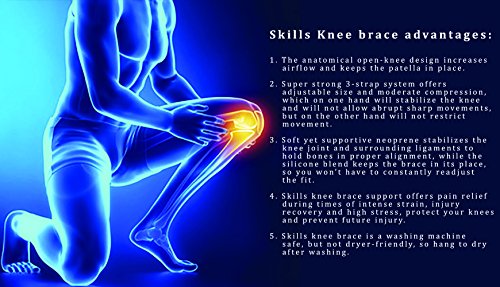 -. Feature : ✔ GET BACK AT IT - You shouldn't have to give up your favorite activities when you're recovering from a painful knee injury! And with a Skills Knee Brace you won't have to! Give your knee the support and protection it needs, while maintaining the active lifestyle you love. Perfect for athletes, runners, hiking, household chores, and yard work, our knee support brace will keep you moving like you used to. / ✔ A BETTER BRACE - Get back in the game with our newly redesigned knee protector brace! Skills created a premium knee support band that is attractive, supportive, and super strong. Our premium velcro closures will never become loose or unsecured mid-motion. And since it's adjustable, the Skills knee support brace fits bodies of all sizes and is suitable for both the left and right leg. / ✔ SWEAT-PROOF SUPPORT - Unlike your typical knee support sleeve, Skills keeps you comfortable through any activity. Our patella knee brace is made out of a soft, breathable neoprene and silicone blend, offering a flexible range of motion and long-lasting support. Plus, it won't slip and slide when you work up a sweat, giving you knee pain relief that stays put. / ✔ BONUS PROTECTION - Keep your wrists safe from unwanted injury with a FREE neoprene wrist wrap! Perfect for brief periods of intense activity such as tennis, basketball, or golf, this wrap will support your wrist with controlled compression. You won't just keep your knee safe and stable, you'll be able to prevent wrist injury with this FREE bonus gift! / ✔ HASSLE-FREE RETURNS - We're here to help get you back up & running, dancing, skiing, or walking in no time! But, if you are not completely satisfied with the quality and protection provided by your Skills Knee Band, send it back within 30 days for a full refund -- no questions asked.
