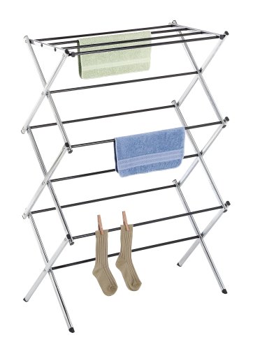 - Feature : Foldout clothes drying rack to save energy and help clothes last longer / Clever accordion design made from steel for durability / Gleaming chrome surface is mildew-proof and rust-resistant / Lightweight and easy to drop into position for use; folds flat for storage / Measures 14-1/2 by 29-1/2 by 41-3/4 inches; also available in white