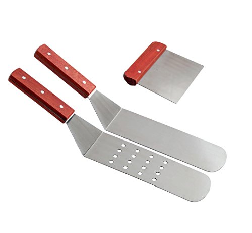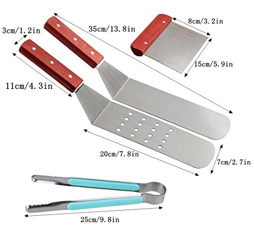 6 TOOLS - Comes with 1 chopper scrapper, 2 professional grade spatulas, 1 tong, 2 condiment dispensers, a perfect BBQ Grill and Griddle Spatulas Tool Kit to any backyard kitchen, great for cookouts, barbecue, caterers, tailgaters, campers and more