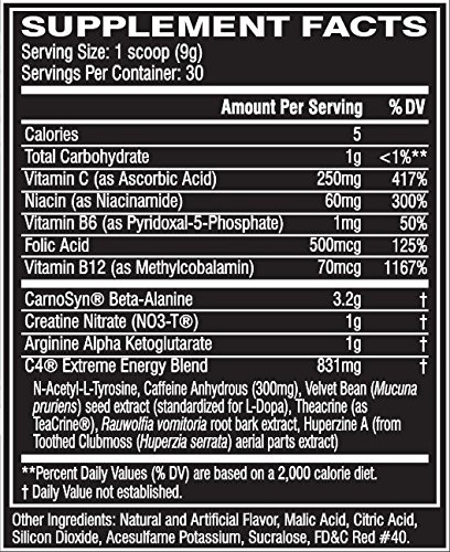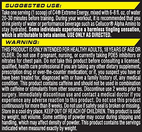 C4 Extreme Energy is the next step for those who want that extra rush. Its formula features twice as much caffeine, more focus and more endurance than C4 Original. C4 Extreme Energy isn’t for the casual gym goer; it’s for those of you who want to explode through their PRs over and over and over again. We know that for some, just a little bit of energy isn’t enough. C4 Extreme Energy is here to help you get up and go, rising to any challenge.Feature