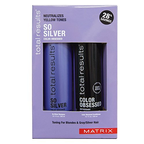 -. Binding : Misc. -. Brand : Matrix -. EAN : 0884486324016 -. Feature : 1 - Color Obsessed So Silver Shampoo 10.1 oz.: Neutralizes unwanted brassiness to eliminate dull, yellow tones.Illuminates highlights on blondes and adds brightness to gray and white hair. / 1 - Color Obsessed Conditioner 10.1 oz: Matrix Total Results Color Obsessed Conditioner is enriched with Vitamin E and Sunflower Oil to help protect against fading and extends the life of your color vibrancy. -. IsAdultProduct : 0 -. Label : Matrix -. Manufacturer : Matrix -. MPN : B06XFN3P1L -. PackageQuantity : 1 -. PartNumber : B06XFN3P1L -. ProductGroup : Beauty -. ProductTypeName : BEAUTY -. Publisher : Matrix -. Studio : Matrix -. Title : Matrix Total Results So Silver Shampoo and Conditioner Duo 10.1oz each -. UPC : 884486324016