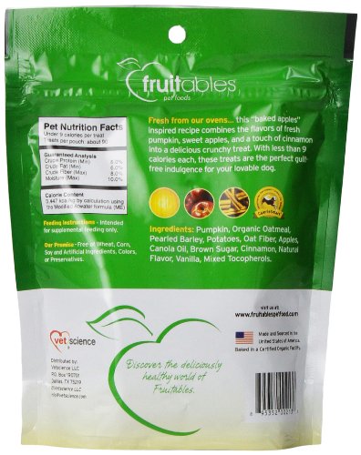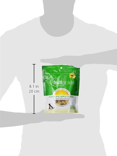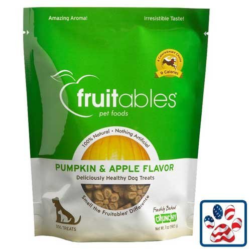 You know what they say about an Apple a day! Using harvest fresh Pumpkin as the #1 ingredient creates a unique sensory experience for you and your pet. Since Pumpkin is classified as a fruit in botanical terms and a vegetable in culinary terms, these treats naturally became Fruitables! Delight your loveable dogs with the amazing aromas, irresistible tastes and satisfying crunch of these unique, all-natural, bite-sized treats. They’re also free of corn, wheat, soy and artificial colors, ingredients or preservatives. Imagine using the finest ingredients in your pantry to create a kitchen filling, delicious muffin aroma that tastes as great as it smells! Fruitables takes the same approach to baking our treats, making it easy for you to indulge and enjoy giving to your pet. Rich in antioxidants, high in fiber and with under 9 calories per treat, Fruitables are also a sensible way to treat/reward your pet and avoid excessive “hidden” calories that often lead to pet obesity. Each recyclable 7 oz. pouch contains about 90 treats. Suitable for dogs of all sizes; plus many pet owners have written to tell us their horses, rabbits, guinea pigs, hamsters, pet rats, birds and some cats absolutely crave Fruitables! Intended for supplemental feeding only, feed up to 4 treats per day for every 10 pounds your dog weighs.Feature