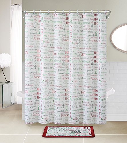 VCNY Home HOLIDAY COLLAGE 14 Piece Bath Set: Shower Curtain, 1 Bath Mat, 12 Rings, Green/Red