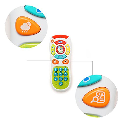Pretend-play remote that introduces numbers, shapes, colors, weather, music, sound effects etc. to keep your baby entertained
