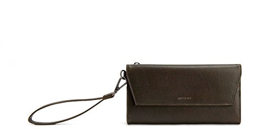Large wallet with two compartments. Front flap with snap closure, and zipper closure on back. Fits iPhone 6 plus. INTERIOR: 18 card slots, 3 bill compartments, zipper coin pocket. Detachable wristlet.