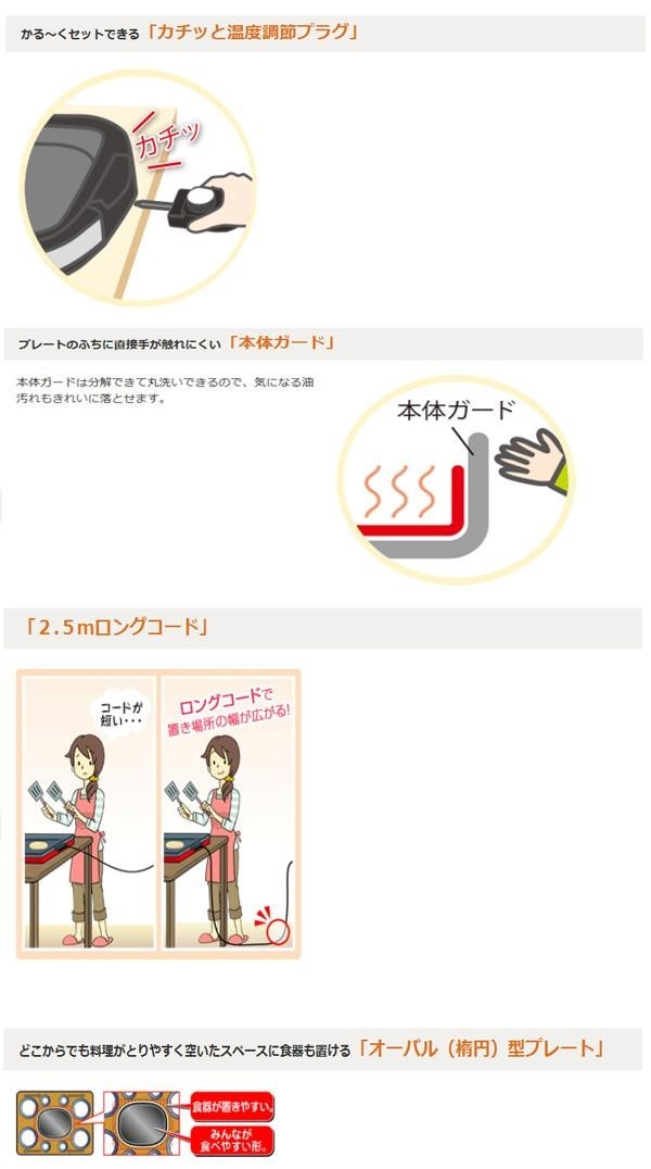 | 仕様 | 温度調節範囲:(保温)80~250度 消費電力:1300W 電源コード:2.5m 電源:100V 丸洗いOK(本体ガード&プレート) |