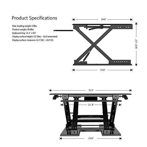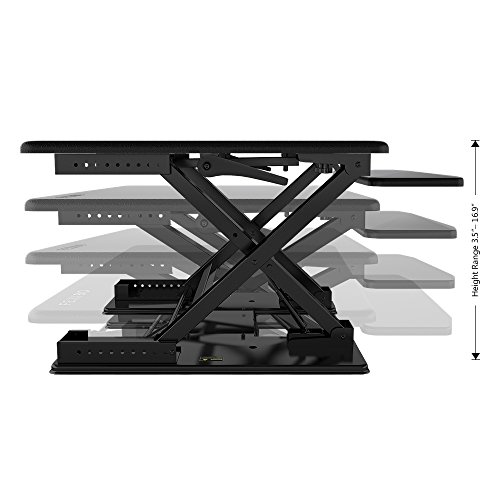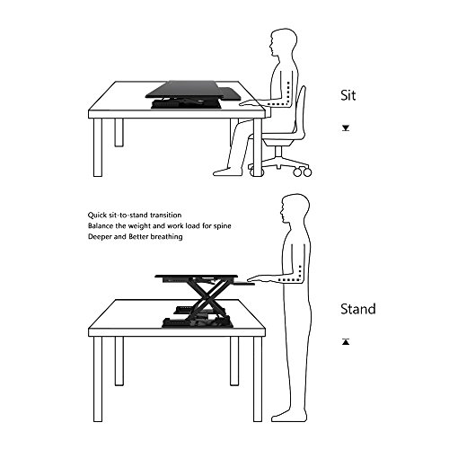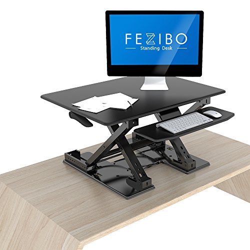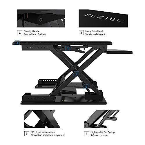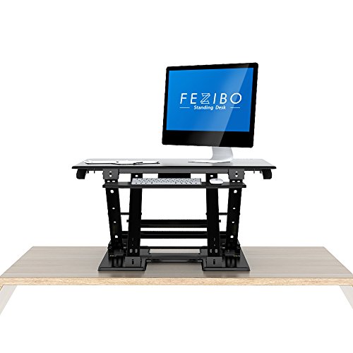 -. Feature : 1.QUICK SIT-TO-STAND TRANSITION: This adjustable workstation enables you to strike a healthy balance between sitting and standing throughout the day, allowing for smooth, stable transitions between positions in a matter of seconds. / 2.EASY OPERATION: A gas-sP.R.Ing hovering system allows you to adjust the workstation with a light squeeze of the handles, easily lifting up to 35 lbs. / 3.VERTICAL TRANSITION: The FEZIBO workstation rises and folds within its own footP.R.Int, from 3.5" flat to 16.9" when fully extended. There's no need to make spatial accommodations between positions. / 4.DUAL-TIER DESIGN: This special design helps keep your shoulders and neck relaxed while working without requiring additional posture adjustment. / 5.HIGH-QUALITY CONSTRUCTION: The FEZIBO desk has undergone extensive testing for balance, stability and movement, including a fatigue test over 6,000 height adjustments. Return within 30 days of receipt. 5-year warranty for main parts.