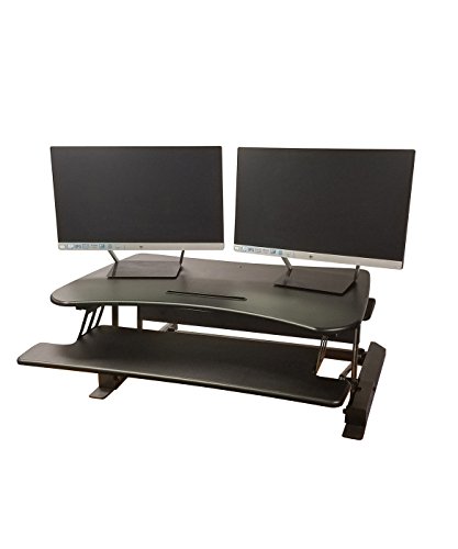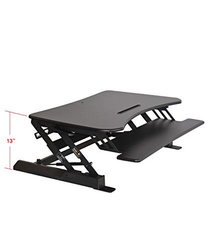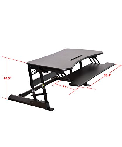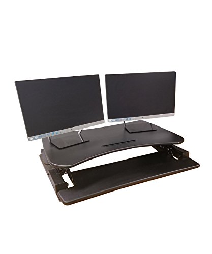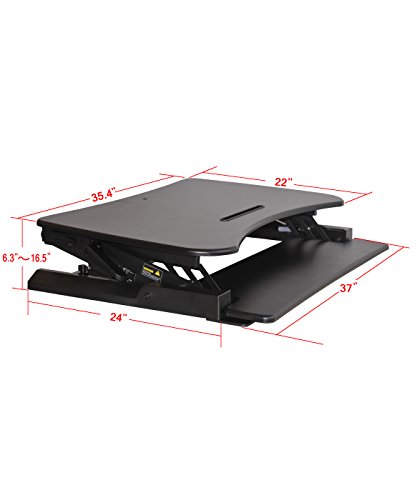 -. Feature : Color: Black ; Supports up to 50 lbs. ; NO ASSEMBLY REQUIRED ; Dimensions: Work Surface: 35.4" x 22" ; Keyboard Tray: 11" x 35.4" ; Overall: 35.4" x 22 x 6.5" ; Height Ranges: 6.3" to 16.5" / DON'T DISMANTLE YOUR ENTIRE OFFICE! Consider a Sit/ Stand Desk instead. Adjustable BOON Living Brand desk riser offers a healthy addition to an existing desk to easily convert a traditional desk into a standing desk. Made of wood and finished with laminate coating for durability and a heavy metal base for stability. The large, 35.4" x 22" work surface sufficiently accommodates two monitors or a monitor and a laptop as well as an iPad, Smart Phone or Tablet in the convenient holder. / INVALUABLE USE! If you have been working or using a conventional desk for several years you may wonder why a moveable top desk would be better, is it really that different? It absolutely is! With the option to adjust the height of one's desk it enables the user to work in many and healthier postures. The human body wasn't made to sit for long periods of time for it tires quickly and the aches and pains start to build up. These can turn into long term issues if ignored. / GO ERGO FRIENDLY! BOON Living Desk Riser offers a healthy, ergonomic keyboard tray that moves up and down with the desk in a stationary position to alleviate sliding. Optimize human well-being and overall system performance with the use of a Sit/ Stand Desk Riser. Improve blood circulation, reduce swelling of the ankles and feet, ease neck and back pain by activating your muscles and preventing muscles weakening. You can even help shape your body by burning extra calories. / INNOVATIVE TECHNOLOGY! Adjustable desk riser is built using innovative pneumatic technology providing sturdy and smooth transitioning during height alteration. Gas sP.R.Ings allow easy movement from up to down and back again, even with your computer equipment. Adjusts to heights between 6.3" and 16.5" with easy to use clamps, just squeeze and lift. Riser comes fully assembled for no fuss, instant use!