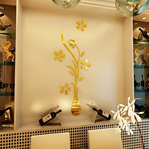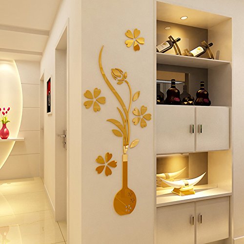 HEYING Mirror Flower Vase 3D Crystal Acrylic DIY Wall Stickers& Murals For Entranceway , Living Bedroom Dining Room Décor Home Decoration (12.2"31.50", Gold)