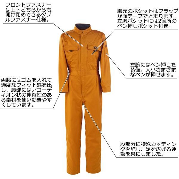 | 肩部分のアクションプリーツや腰部分のアコーディオン状の伸縮素材や股部分の特殊カッティングなど、つなぎ服を着て作業する際の「突っ張り感」を解消する工夫を盛り込みました。フロントファスナーは、上下どちらからも開閉自在のダブルファスナーを採用しています。全身つなぎは一枚で全身を覆ってくれるので、屈んだ時に背中が出るのを気にしないで済むため、作業にはとても向いています。 |