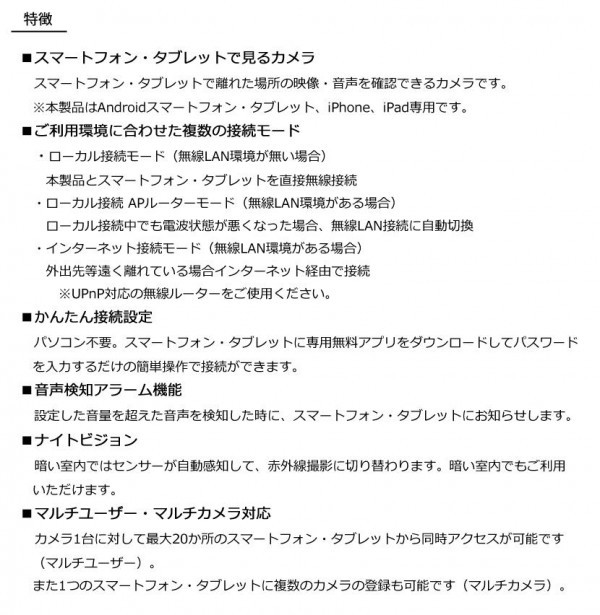 スマートフォン・タブレットで離れた場所の映像・音声を確認できるカメラです。(※製品はAndroidスマートフォン・タブレット、iPhone、iPad専用です。 ) |