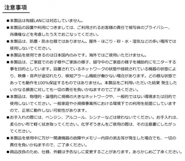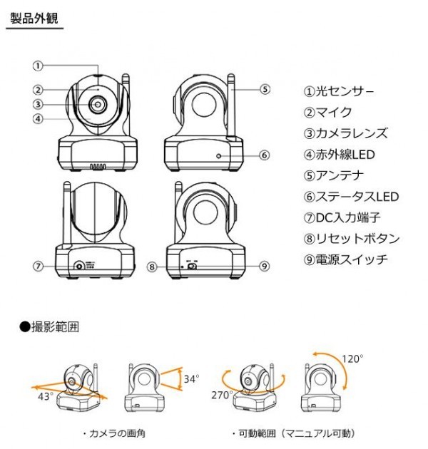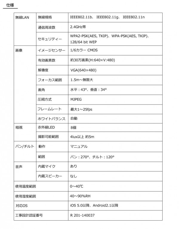 | 仕様 | 【無線LAN】 無線規格:IEEE802.11b、IEEE802.11g、IEEE802.11n 通信周波数:2.4GHz帯 セキュリティー:WPA2-PSK(AES、TKIP)、WPA-PSK(AES、TKIP)、128/64 bit WEP 【画像】 イメージセンサー:1/6カラー CMOS 有効画素数:約30万画素(H:640×V:480) 解像度:VGA(640×480) フォーカス範囲:1.5m~無限大 画角/水平:43度・垂直:34度 圧縮方式:MJPEG フレームレート:最大1~25fps ホワイトバランス:自動 【暗視】 赤外線LED:8個 撮影可能範囲:4lux以上 約5m 【パン/チルト】 動作:マニュアル 範囲/パン:270度・チルト:120度 【音声】 内蔵マイク:あり 内蔵スピーカー:なし 使用温度範囲:0~40度 使用湿度範囲:40~90%RH 対応OS:iOS 5.0以降、Android2.1以降 工事設計認証番号:R 201-140037 |