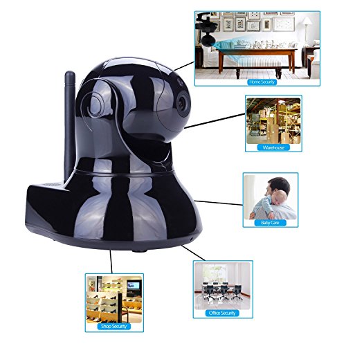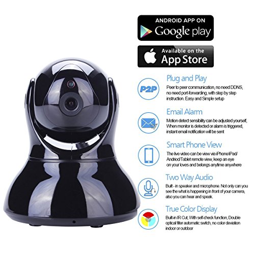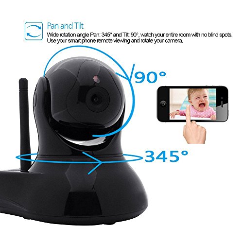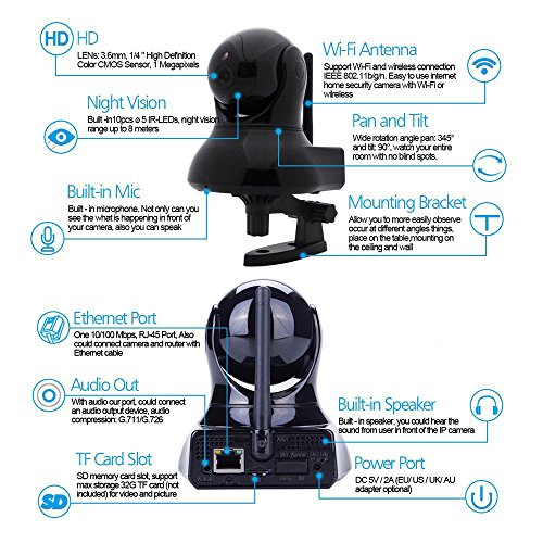 [Wi-Fi IP Camera] Network IP Camera, J-DEAL® Indoor Wireless Day Night Pan/Tilt Baby Monitor / Surveillance WIFI CCTV IR Security Camera, and MORE (HD 1280x720p Mega Pixels, IR-Cut Two-Way audio Two Way Talk, Built-in Mic & Speaker, QR Code Scan & Connect, iOS & Android Mobile View, Motion Detection & Push Notification pan 345°and tilt 90° Specification: Image sensor: 1/4 Color CMOS Lens: 3.6MM Infrared LEDS: 10PCS ø 5 Image: 1 Mega pixels Night Visibility: 10pcs / ø 5 IR-LEDs, night vision range up to 8 meters AWS/AGC/AES/ exposure: Auto Mini. Illumination: 0.1Lux Audio Audio: Two-way audio Input: Built-in speaker Output: Built-in Microphone Video Image Format: PAL/NTSC Image Compression: H.264 Image Frame Rate: 30fps Resolution: 1280x720(720P),640×480(VGA), 320×240(QVGA) PTZ Pan/tilt: Horizontal 345; Vertical 90° Network Wi-Fi: IEEE 802.11b/g/n Supported Protocol: TCP/UDP/IP/ARP/ICMP/DHCP/DNS/HTTP/FTP/SMTP/NTP/PPPOE/UPNP/DDNS/RTSP Alarm Motion Detection: Send image pictures to Email/FTP within the Provided time General SD Card: 32GB SD card slot(not included) Friendly use: Plug and Play function Web browser: IE 6.0 or above version, Mozilla Firefox, Safari, Opera, Chrome ,etc Mobile view: Support Android, Iphone and other smart mobile phone, Iphone push Power: DC 5V 2.0A Power consumption: 10W/6W (Infrared on/off) Operating temperature: 0 to+55 °C Storage temperature: -10 to+60 °C Operating humidity: 20- 80%RH Storage humidity: 0- 95%RH Net Weight: 540g(Main body) Certification: CE; FCC; RoHS Package Included: 1x 720P IP Camera 1x Power Charger 1x CD (driver and tool) 1x Mounting bracket 1x The instructions 1x Some ScrewsFeature