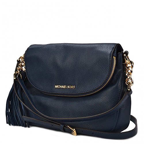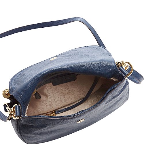 -. Feature : Navy soft venus pebble leather. / Magnetic snap closure. Gold-tone hardware. Large Zipped Compartment on flap. / Chain and leather shoulder strap, 9" drop; Adjustable, detachable long strap with 22" drop / Interior zip and magnetic-snap pockets; six card slots. MK Logo-P.R.Int lining. / Medium size bag: 7" (H) x 11" (W) x 3" (D).