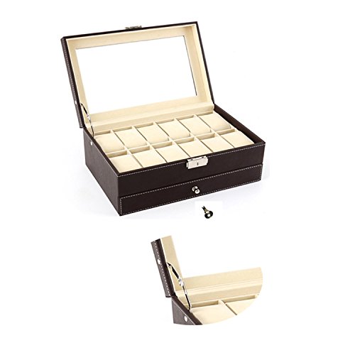 -. Feature : Product Dimensions (L x W x H): 12" x 8" x 5" (30.5 x 20.5 x 13 cm) / Metal Lock,Brown High Grade PU Leather surface,velvet interior and pillows,Two levels,first level includes 12 removable velvet pillows,second level is a jewelry tray / Clear glass top gives you a open view and you can find your favorite treasure in seconds with this unique watch and jewelry box.Perfect for home and business use, and a wonderful gift idea / Suits for storing watches,jewelry,cuff links,spare links,rings,earrings,bracelets and necklaces / You will be 100% satisfied with our product!Autoark is so confident you'll love our products,if you're not completely satisfied you'll be offered a prompt refund or replacement,no questions asked