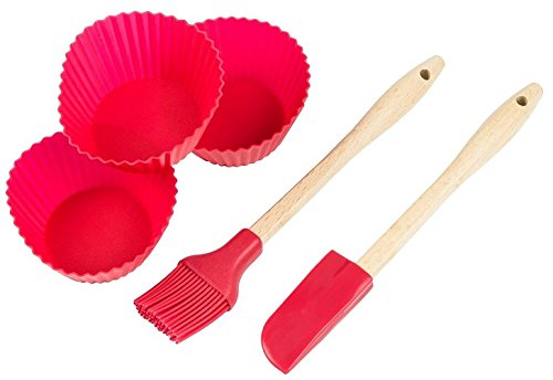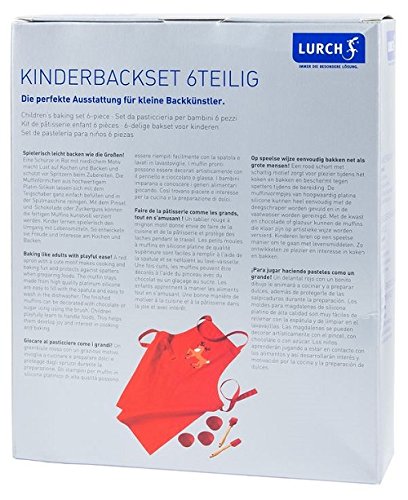 The perfect set for little bakers: 1 x apron, 1 x silicone brush, 1 x silicone dough scraper, 3 x muffin moulds 100% platinum silicone baking moulds Temperature-safe between -40°C to +240°C/ -40°F to +464°F Food safe, fruit acid resistant Dishwasher safe Material: Textile / silicone / wood
