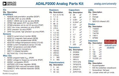 The Analog Parts Kit ADALP2000 contains a large selection of components perfect for creating a wide variety of useful circuits & devices. Featuring Analog Devices components, the kit includes transistors, resistors, capacitors, diodes, sensors, and variety of useful ICs including Op Amps, convertors, and regulators. Finally, the kit also comes with an assortment of lead wires, a solderless breadboard, and a screwdriver.Content: (SMD parts are mounted on DIP PCBs): AD8226 instrumentation amplifier, ADTL082 JFET opamp, AD8541CMOS rail-to-rail opamp, OP482 high speed JFET opamp, OP484 precision rail-to-rail opamp, OP27 low noise precision opamp, OP37 precision opamp, OP97 low power high precision opamp, AD8210 current shunt monitor, AD22151 magnetic field sensor, ADXL327 3-axis accelerometer, AD22100 voltage temperature sensor, AD592 current temperature sensor, TMP01 temperature controller, MIC electret microphone, QSD123 infrared transistor, B57164K103J 10Kohm thermistor, AD584 programmable VREF, AD654 voltage-to-frequency converter, AD8561 comparator, ADP3300 LDO linear regulator, SSM2220 PNP matched transistor, SSM2212 NPN matched transistor, resistors, potentiometers, capacitors, LEDs, QED123 infrared LED, inductors, transistors (2N3904, 2N3906, HEF4007, IRF510, TIP31CFS, TIP32CFS, ZVN2110A, ZVN3310, ZVP2110A), diodes (1N3064, 1N4001, 1N4735, 1N914, OP999)