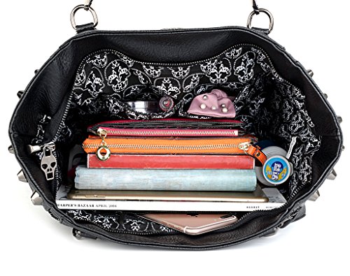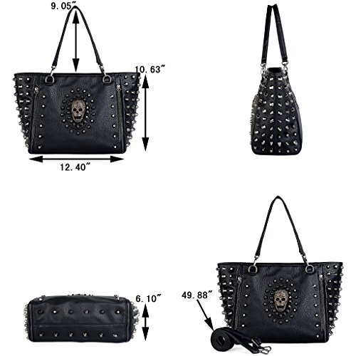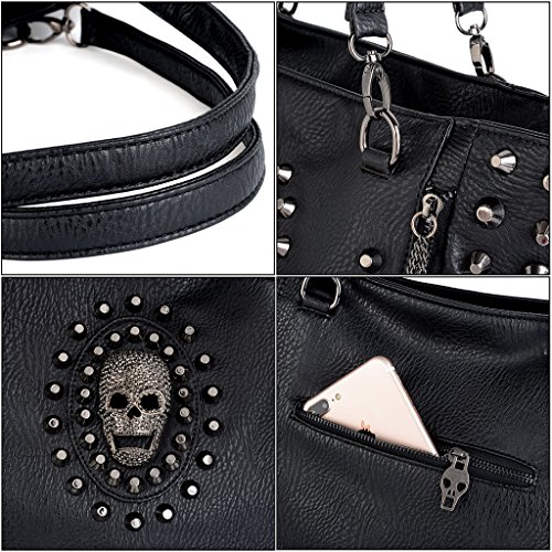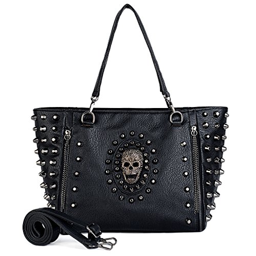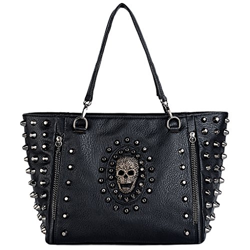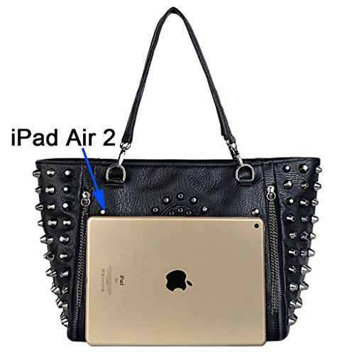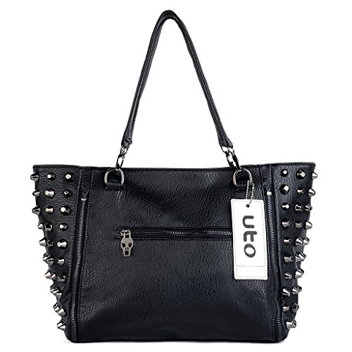 -. Brand : UTO -. Department : womens -. Feature : HIGH QUALITY - Ultra soft synthetic washed leather with heavy duty zipper hardware. 2 detachable top handles and 1 removable/adjustable shoulder strap. / WELL DESIGN - Heavy duty zipper hardware. Detailed streamlined stiching. Full-lined pattern polyester lining. / LARGE CAPACITY - Interior: 1 large zipper compartment contains 1 internal zip pockets and 2 open pockets. Exterior: 1 back zipper pocket. / EXTREMELY PRACTICAL - Comfortably holds a 9.7" iPad Pro, tablet or a laptop 10" and under. Exterior pockets can hold your smartphone, cosmetic, hair band, house keys and other tiny items. / DIMENSIONS - 12.40"L x 6.10"W x 10.63"H. Weight: 2.56 pounds. Adjustable shoulder strap: 49.88"(longest size). Handle drop: 9.05". -. ProductGroup : Shoes -. ProductTypeName : HANDBAG -. Title : UTO Women Skull Tote Bag PU Washed Leather Rivet Studded Ladies Purse Shoulder Bag