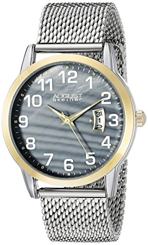 -. Binding : Watch -. Brand : August Steiner -. Color : Silver/Black/Gold -. Department : mens -. EAN : 0848572070737 -. Feature : Gray mother of pearl dial featuring three hand movement with date display window at 3 o'clock / Printed Arabic numerals with luminescent filled dauphine style hour and minute hands / Polished two tone ion plated alloy case with fine mesh stainless steel bracelet / Quartz movement with analog display / Water-resistant to 30 M (100 feet) -. Label : TWI Watches, LLC -. Manufacturer : TWI Watches, LLC -. Model : AS8195SSG -. MPN : AS8195SSG -. PackageQuantity : 1 -. PartNumber : AS8195SSG -. ProductGroup : Watch -. ProductTypeName : WATCH -. Publisher : TWI Watches, LLC -. Studio : TWI Watches, LLC -. Title : August Steiner Men's AS8195 Round Gray Mother of Pearl Dial Three Hand Quartz Two Tone Bracelet Watch -. UPC : 848572070737