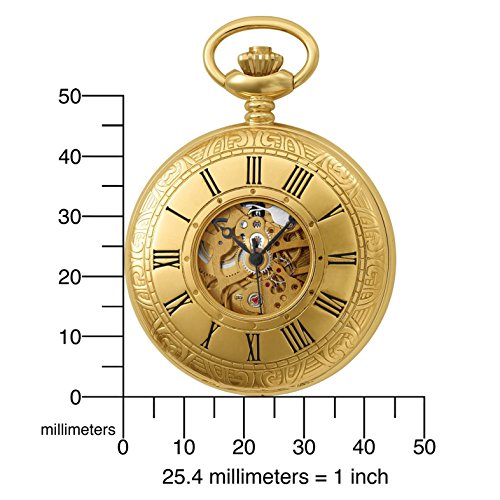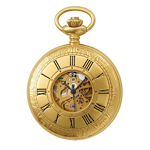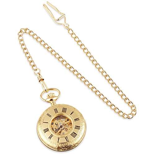 -. Feature : Gold-plated brass 47mm demy hunter case with a matching curb chain / Skeleton dial with roman numerals / 17 jewel mechanical movement / Deluxe gift box