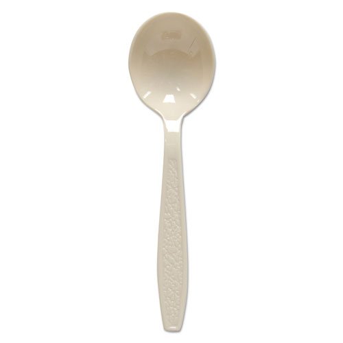 Studio : Solo Publisher : Solo Binding : Misc. Product Description Solo Guildware extra heavy weight polystyrene soup spoon with a premier look and feel, Guildware adds a finishing touch to every meal occasion. The extra heavy weight polystyrene cutlery delivers the durability to handle dense foods like fish and steak. The ideal product when only the best will do. Look and performance of permanent flatware, designer styling with textured handles. Full length perfect for steakhouse takeout, catering and other high-end meal service occasions. Classic design retains legacy Sweetheart features and quality. Adds a finishing touch to every meal. Hot and cold applications. 7-inches Length. Champagne color. Special features: bulk packed and full length. 0