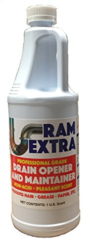-. Feature : Ram Extra is an extra-strength drain opener that blasts away the toughest clogs. / Quickly dissolves grease, paper, rags, hair, soap, etc. with a fresh lemon scent to cover up any odors resulting from product dissolving clogging matter / Penetrates clogging masses, converting them to soft pulp that flushes through the system. / Contains 40% Sodium Hydroxide with added surfactants and fresh lemon scent. / Harmless to plumbing and septic systems when used as directed. It should not be used in garbage disposals.