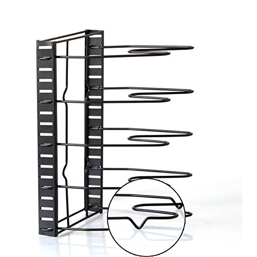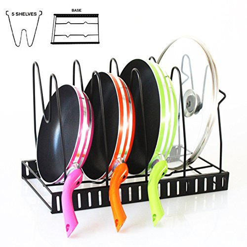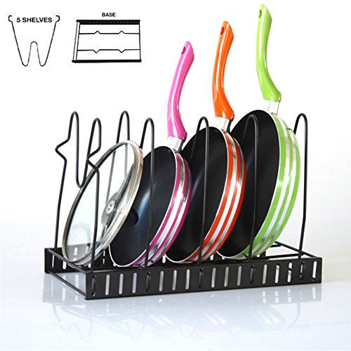 Features: Product size : 15 x 8.5 x 10 inch / 38 x 21 x 25.5 cm; Compartments Width: approximately 2.3-2.5 inch /5.8-6.4 cm . Package Size : 38 x 21 x 4 cm/14.9 x 8 x1.6 in Capacity: store up to 5 Pans ,Pantry Pans or Pot Lid Applicable occasions: Fitted for chopping board, pans, pod lid ,any kitchen tools that you can put and you can also hanging towels making you kitchen neat. After now, it will bring you pleasure mood. Packing list: 5 pcs shelves and 1 base. 0