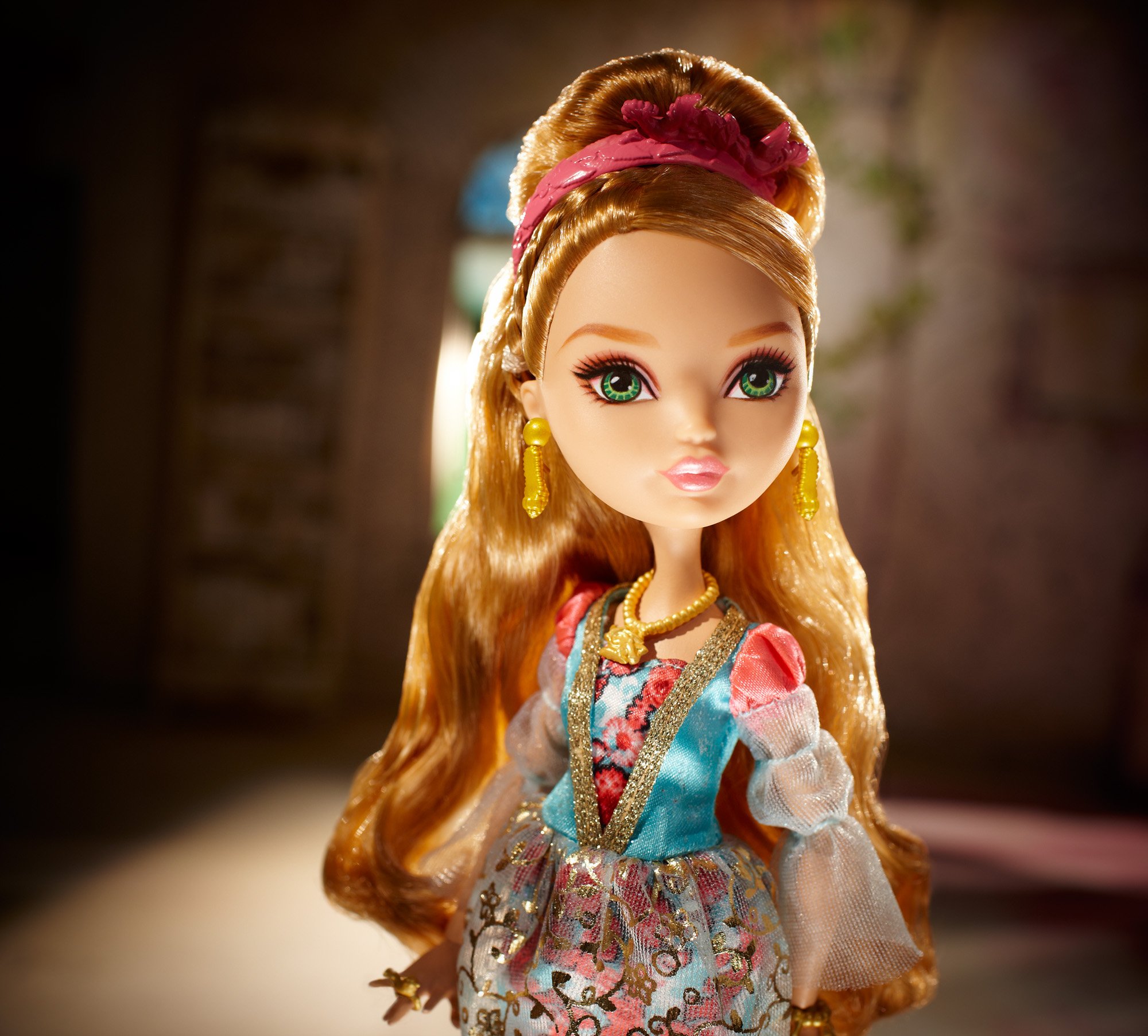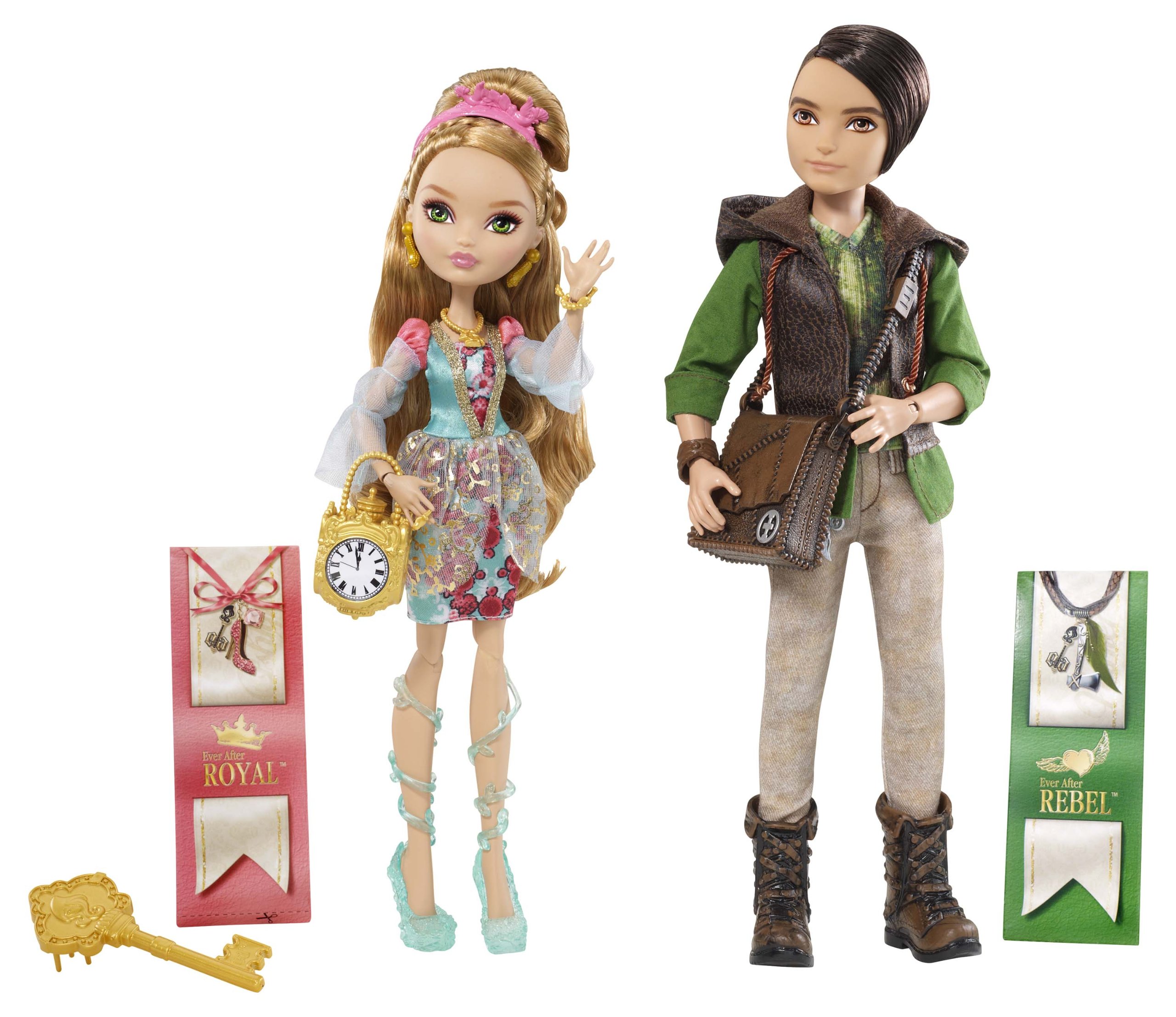 Ever After High Ashlynn Ella and Hunter Huntsman Dolls Ashlynn Ella wears a spellbinding dress with floral print, while Hunter Hunstman features a green shirt and brown hoodie. View larger