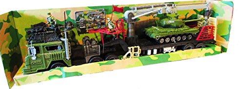 -. Feature : Military Truck Open Window Retail Box Dimensions: 33" x 10" x 6". / Dimensions of Truck: 31" x 7" x 5" (Length x Width x Height). / Assorted accessories: Army Soldiers and Military Weapons. / Army Truck comes assorted with either a Tank or Helicopter. / The tank measures 11" x 5" x 4" and has moving wheels. Turret and crane can rotate. Helicopter is 13" x 6" x 4" with moveable propellers.