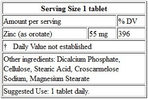 Supplement FactsServing Size: 1 TabletServings Per Container: 100Amount Per Serving% Daily Value***Zinc (as Orotate)55 mg396 ***Percent Daily Values are based on a 2,000 calorie diet