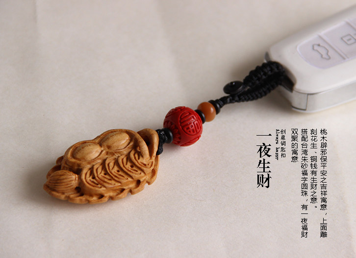 桃木辟邪保平安之吉祥寓意,上面雕刻花生、铜钱有生财之意。
