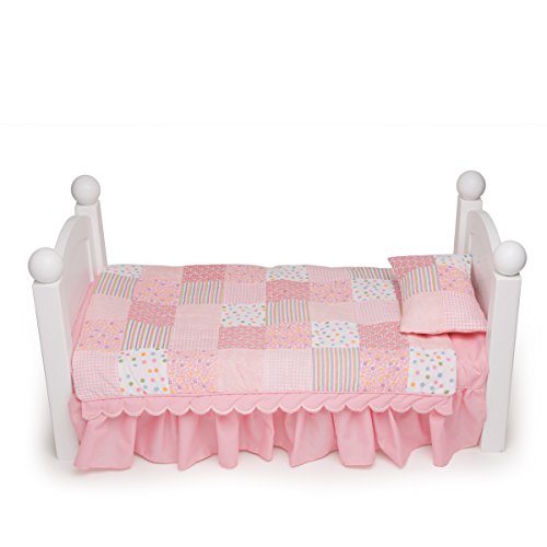 -. Feature : 5-piece bedding set includes quilt, pillow, pillowcase, covered mattress and bottom sheet with dust ruffle / Pretty patterned quilt has stitched fabric squares and scalloped edge / Shown with the KM1 Maplelea Bed, sold separately / This is the amazing Maplelea quality you've been hearing about / Fits Maplelea, American Girl, Journey Girls, Our Generation and other comparable 18 inch doll beds