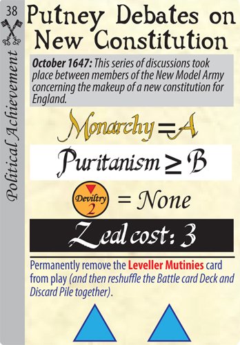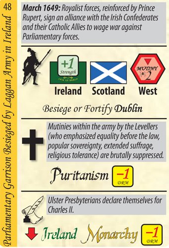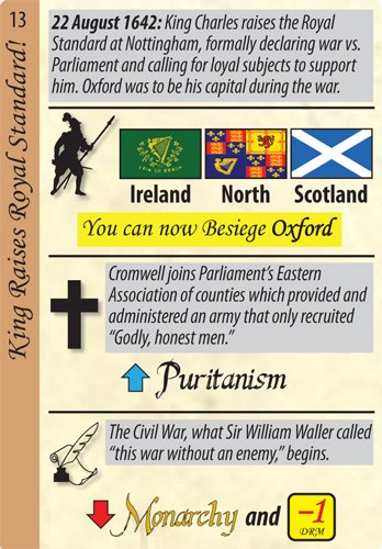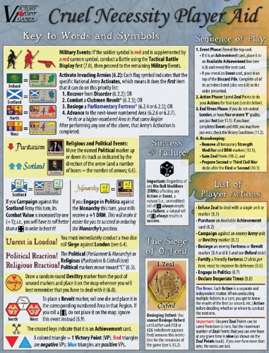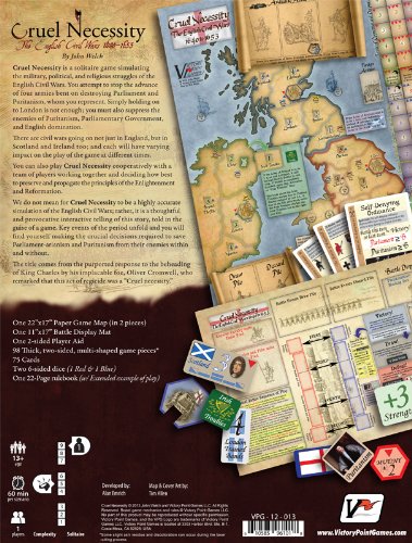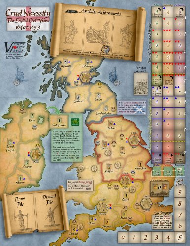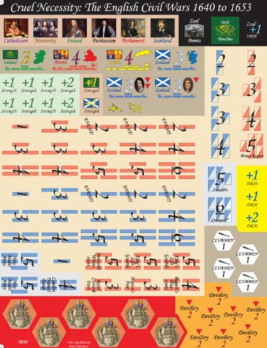 Cruel Necessity, from designer John Welch, is a solitaire game simulating the military, political, and religious struggles of the English Civil Wars (1640-53). You attempt to stop the advance of four armies bent on destroying Parliament and Puritanism, whom you represent; simply holding on to London is not enough!There are civil wars going on not just in England, but in Scotland and Ireland too; and each will have varying impact on the play of the game at different times. You can also play Cruel Necessity cooperatively with a team of players working together and deciding how best to preserve and propagate the principles of the Enlightenment and Reformation.