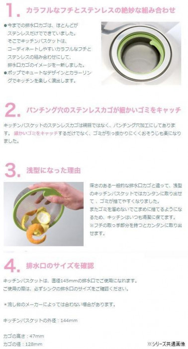 | 「排水口の詰まりをなくす、カラフルなカゴがほしい」そんな悩みはキッチンバスケットが解決します。ステンレスの細かいパンチングカゴが、しっかりゴミをキャッチ。浅型にしてゴミを溜めずに捨てやすくしました。 |