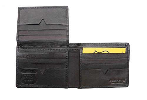 RFID SHIELD wallet: Ashlin?RFID Blocking Men's wallet features a flip-up section, with total 16 credit card pockets. Our ASHLIN RFID blocking wallet provide protection to your credit cards that have a Paypass feature or other cards with embedded IDs. The dimensions of the wallet are 3.54"H x 4.13"W x 0.59"D ? What is RFID? Radio-Frequency Identification (RFID) is the use of radio waves to read and capture information stored on a tag attached to an object. A tag can be read from up to several feet away and does not need to be within direct line-of-sight of the reader to be tracked. ? How RFID works? RFID chips work by using radio waves to communicate. The object, such as a credit card, contains an RFID tag with information, and an RFID reader uses radio waves to read the information from a tag. The key is that RFID chips have tiny electromagnetic fields, which is what makes them possible to read without having to “initiate” communications. ? Why use RFID Wallet? RFID-blocking wallets are designed to help insulate you from a very particular brand of electronic pickpocketing, called RFID skimming. The concern is that some credit cards, passports, and driver’s licenses now come with embedded radio frequency identification chips. When activated by an RFID reader, these chips transmit certain types of information wirelessly, so that you can verify your identity or even make a purchase without swiping your card. This wallet includes Embedded RFID-blocking shield which prevents electronic identity theft. RFID SHIELD wallet: Genuine Leather - 100% handmade, we use only the finest cowhide; known for its softness, prized for its durability. Our artisans hand-cut the leather specifically to our own designs. 0 |