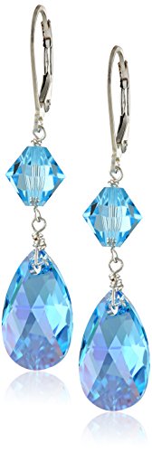 Sterling Silver Swarovski Elements Aquamarine Color Aurora Borealis Pear Shape and Bicone Drop Earrings
