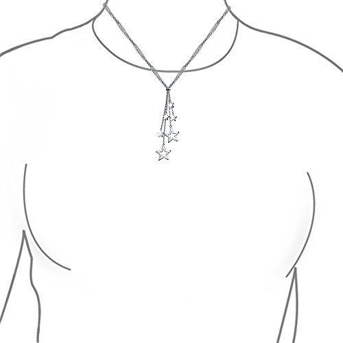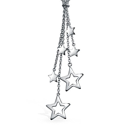 This lariat necklace is made of solid .925 Sterling Silver. With an eye catching triple chain, this celestial piece hosts a striking assortment of open stars that drop 2.5 inches in a lariat style from a 15 inch chain. This piece of trendy fashion jewelry has a delicate feel and features a lobster claw clasp to ensure maximum functionality. Buy with our matching star jewelry for a look thats out of this world. Perfect to wear to prom. Buy yours today.