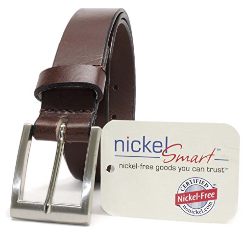 -. Binding : Apparel -. Brand : Nickel Smart TM -. Department : mens -. Feature : GENUINE TOP GRAIN LEATHER STRAP: Choice of brown or black; 1.25" (32 mm) wide; top grain leather / NONICKEL: Brushed finish silver-tone buckle is the perfect accent plus it is Certified Nickel FreeTM! / YOU NEED THIS BELT: Whether you choose black or brown, each belt is an example of fine quality workmanship that you will long enjoy! / GUARANTEE: Lifetime guarantee to never test positive for nickel / SIZING: SEE SECONDARY IMAGE FOR HELPFUL SIZING TIPS! -. ProductGroup : Apparel -. ProductTypeName : ACCESSORY -. Title : Nickel Free Silver Square Belt-Handmade in USA