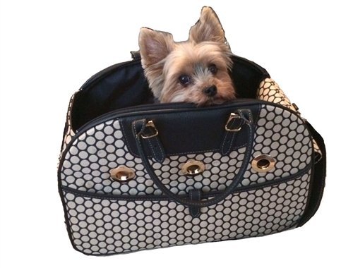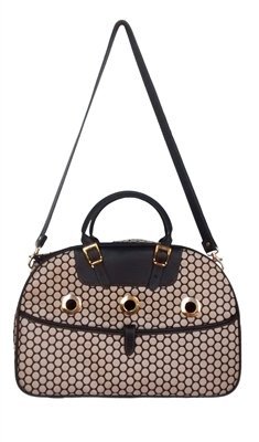 -. Feature : Italian black leather trim, leather top handles and detachable leather shoulder strap / Removable Faux Fur Bedding, Interior safety hook for collar/harness / Zip-top entry/designer grommet ventilation holes / Mesh panel on both ends with roll-down flaps to enclose / Gold plated designer hardware. Side pocket for storage. Airline Approved.