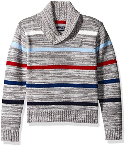 Nautica Big Boys Shawl Collar 'Merry Mariner' Striped Sweater With Button Closure, Medium Grey Heather, Small