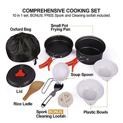 ✔ BENEFICIAL Kit: The 10 pieces camping cookware kit includes Pot + Pot Cover + Frying Pan + 2 Bowls + Soup Spoon + Bamboo Rice Ladle + FREE Foldable Spork + FREE Cleaning Loofah + Oxford Bag. Pot size: 5.9"x2.83". Frying pan size: 5.98"x1.46". Perfect size for 1 or 2 adult hiker, backpacker to use.
