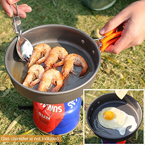 ✔ LIGHTWEIGHT AND PORTABLE: Weight of this backpacking cookware kit is 18oz, as light as a bottle of 0.5 liter water. Entire non-stick folding camping pots and pans set is tossed into an oxford bag with drawstring, which can be carried anywhere you go.