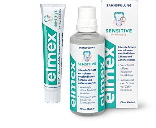 -. Binding : Misc. -. Brand : Elmex -. EAN : 6202566158308 -. Feature : Elmex Sensitive Toothpaste, 75ml / 2.5 fl.oz - is ideal for special care and protection of sensitive teeth and exposed tooth necks / Elmex Sensitive mouthwash with Amine Fluoride, 400 ml / 13.3 fl.oz - especially developed for dental hygiene in areas difficult to access in case of sensitive teeth -. Label : Elmex -. Manufacturer : Elmex -. PackageQuantity : 2 -. ProductGroup : Health and Beauty -. ProductTypeName : BEAUTY -. Publisher : Elmex -. Studio : Elmex -. Title : Elmex Sensitive dental solution/mouthwash with Amine Fluoride, 400 ml & Elmex Sensitive Toothpaste (2 Pack)