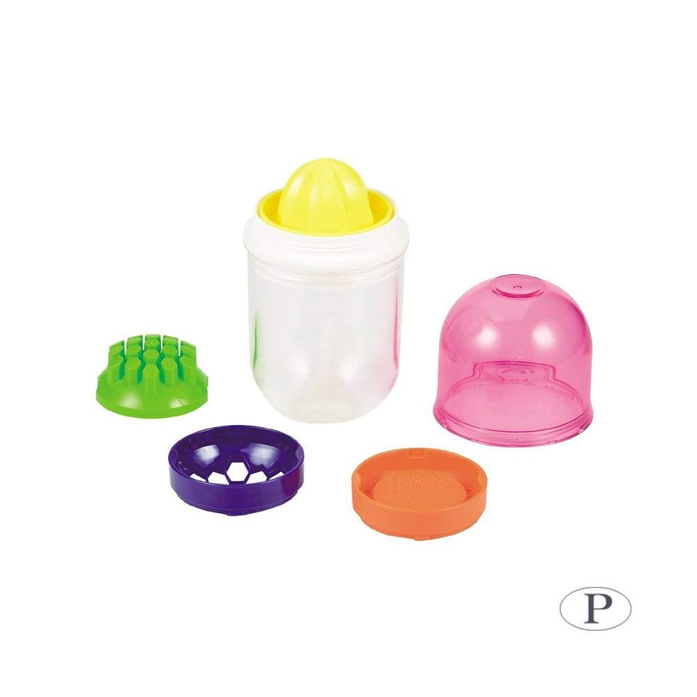 | 「フルーツカッター」「おろし器」「しぼり器」がセットになった便利なシェーカー!お好きなフルーツと牛乳・ヨーグルトを入れて振るだけで簡単にオリジナルドリンクができます。50mL単位の目盛り付きです。 |