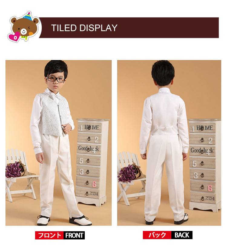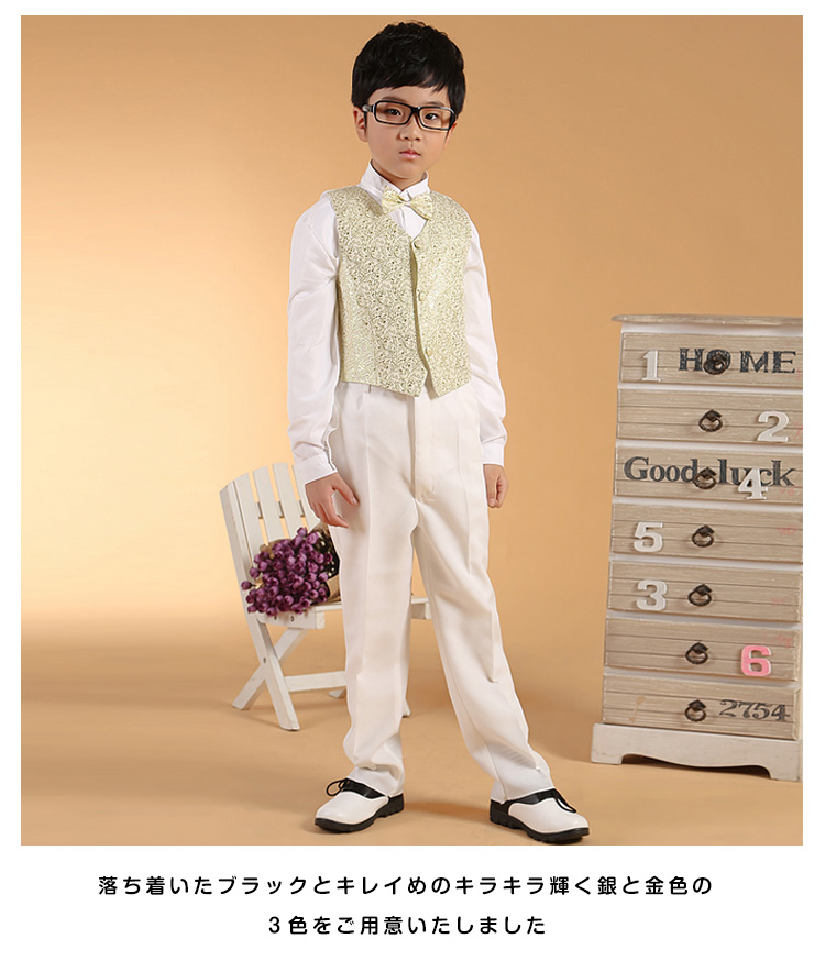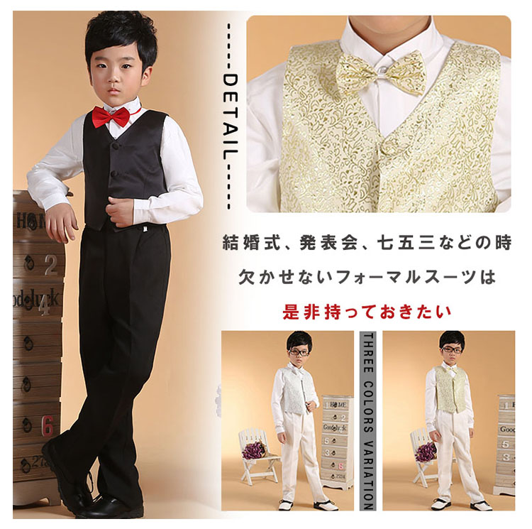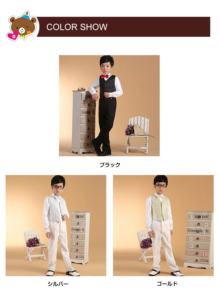 | 結婚式、発表会、七五三などの時欠かせないフォーマルスーツは是非持っておきたいゆったり着れて、リラックス感ときちんと感の両方を合わせ持つスーツセット落ち着いたブラックとキレイめのキラキラ輝く銀と金色の3色をご用意いたしました上品さ漂うから、ギフトとしても喜ばれること間違いなし。 | |