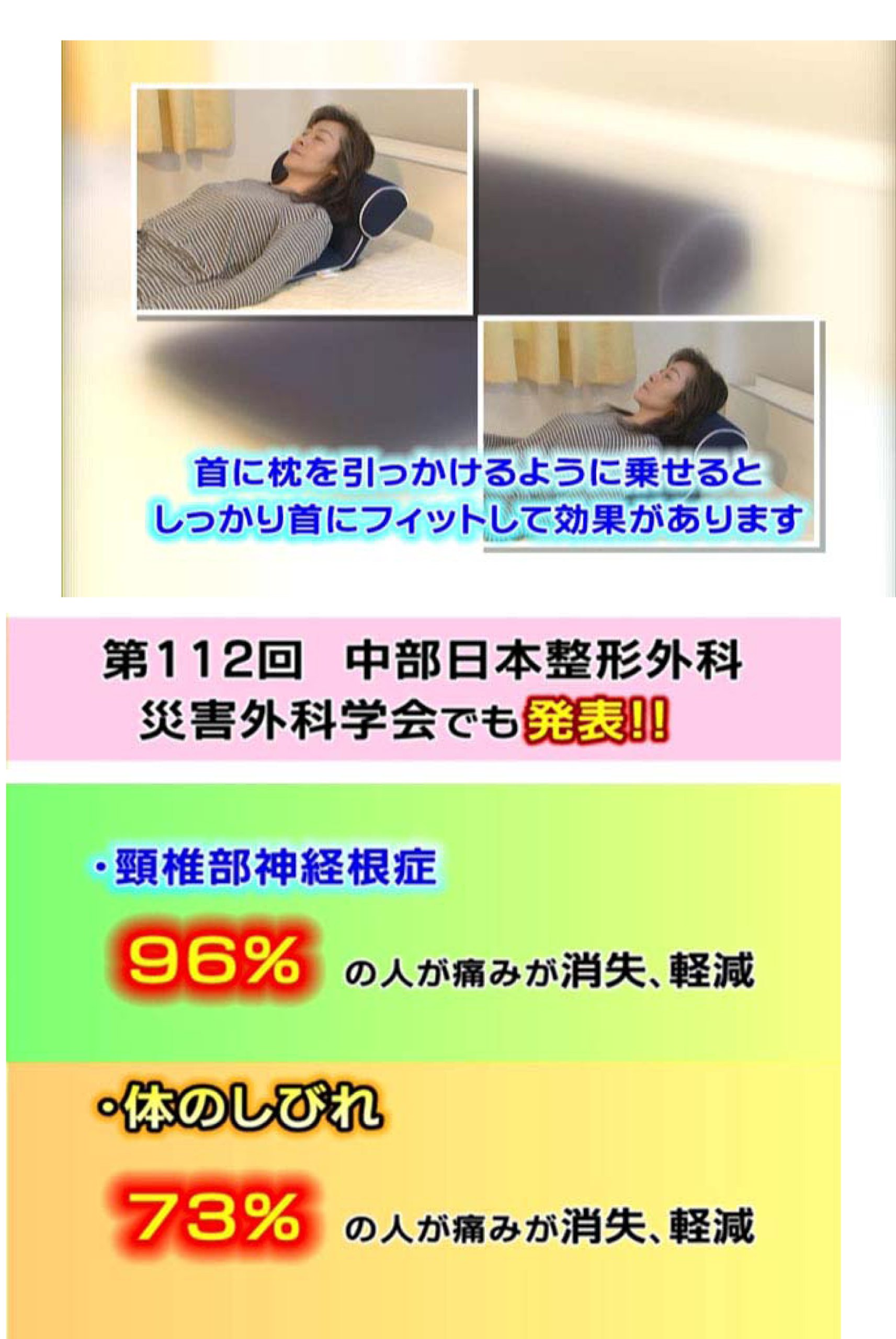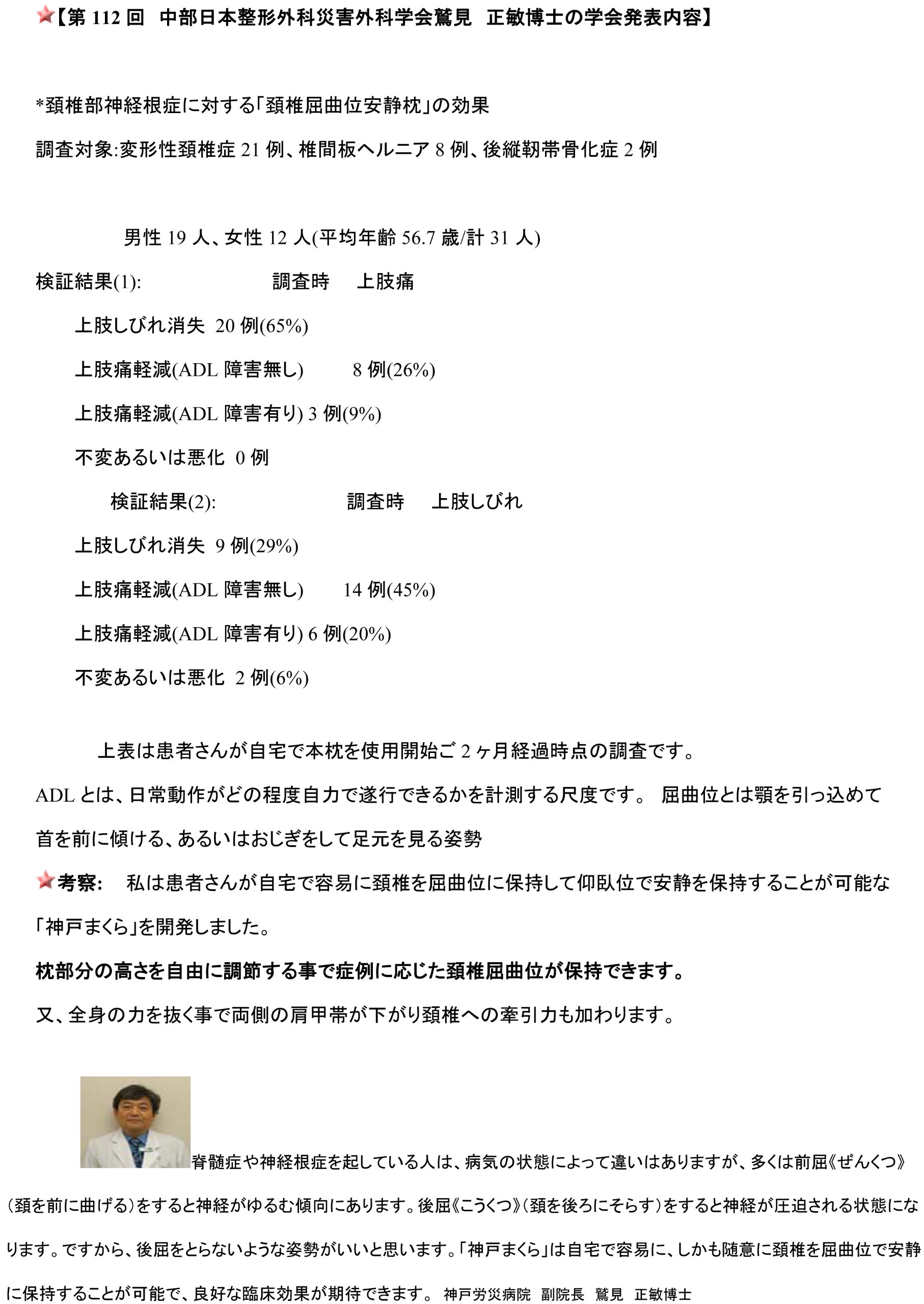 : Polyester 100% Urethane foam / Steel pipe Size: W45cxD60cxH13c Thickness 65 m / m Weight: 2.2 Navy 112 th Central Japan Orthopedic Surgery Surgical Society Dr. Masatoshi Hasami's conference presentation contents * Cervical vertebrae flexion pillow