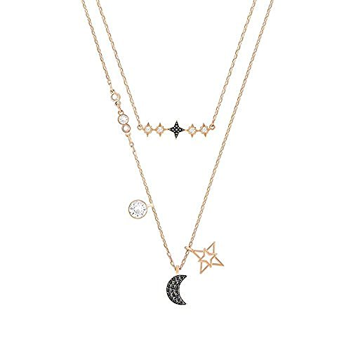 From Swarovski, this whimsical Glowing Moon necklace style makes a wonderful gift or the perfect addition to your own jewelry assortment. This versatile style comes with two separate necklaces that can be worn layered together or separately on their own, for a variety of looks. The necklaces are crafted in rose gold-plated metal and are adorned with clear and colored Swarovski crystals for noticeable sparkle and shine. The longer necklace features a dainty star pendant and a moon that is studded with pavé black Swarovski crystals. The shorter necklace features a straight row of five crystal-studded stars, the center of which is black. The longer necklace measures 15 3/4 inches in length and the shorter necklace measures 14 1/8 inches in length. Both necklaces also have extenders for adjustability.Feature